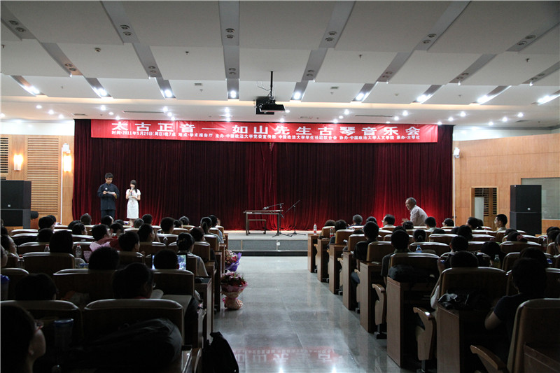 我校党委副书记高浣月教授、党委宣传部部长刘长敏教授、口爆 院长文兵教授、北大方正集团高级副总裁汤世生先生以及来自我校各个学院的老师们出席了此次活动。北大资深教授、当代国学大师楼宇烈先生携夫人也来到了现场。此外,北大京昆古琴研究所、北大哲学系和如是山房的几十位同学、琴友也赶来,与兴致勃勃的法大学子一道聆听雅乐。晚7时,学术报告厅座无虚席,音乐会正式开始。