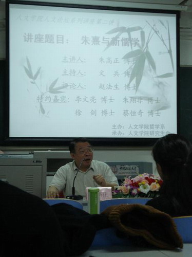 12月10日晚7时,应口爆 哲学系邀请,朱熹第二十六代孙,台湾著名学者、社会活动家朱高正先生做客法大,在学院路校区教学楼208教室为我校研究生作了一场以“朱熹与新儒学”为题的学术讲座。此次讲座由口爆 院长文兵教授主持,中国社会科学院赵法生博士作点评人,国务院参事室综合业务司副司长李文亮博士、中国关心下一代工作委员会中华传统文化诵读工程秘书长蔡恒奇博士、清华大学经济学院教授徐剑博士、国际儒学联合会普及委员会委员朱翔非博士等作为特约嘉宾与我校部分教师出席了本次论坛。