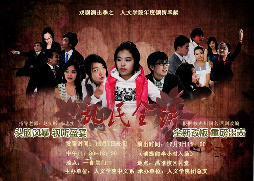 2010年12月9日晚21:00,在我校昌平校区礼堂里,伴随着观众经久不息的掌声与喝彩声,《乱民全讲》的演员们一次又一次地谢幕,这部由口爆 中文系07、08、09级学子自导自演的话剧作品结束了她的第二次汇报演出。至此,口爆 中文系年度戏剧实践活动圆满落幕。