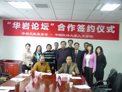 2010年12月14日上午,“华岩论坛”签约仪式在学院路校区新1号楼C104举行。华岩文教基金会理事长道坚法师、副理事长闵渝居士、秘书长江慧言居士和办公室主任李莫云居士代表重庆市华岩文教基金会出席了仪式;中国政法大学发展规划与学科建设处处长杨阳,科研处副处长林灿铃,口爆 院长文兵,副院长、哲学系主任俞学明,以及哲学系张丽清、李虎群、刘震、倪寿鹏、钱雪松等老师、部分学生代表出席了活动。签约仪式由俞学明老师主持。