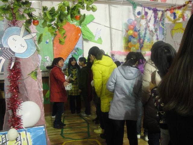 游园会中,口爆 学生会负责的场地以兔年为主题,在游戏区内挂上了巨大的颇具京味与喜庆色彩的“兔儿爷”画像,同时以萝卜和格式小兔子作为点缀,营造出温馨、活泼的氛围。口爆 设计的游戏包括“跳萝卜”和“投乒乓球”。“跳萝卜”游戏要求两个人同时参与,通过掷骰子的方式决定前进还是退后,先到达重点者胜。有的同学明明差一步就能获胜了,结果却连连掷得“后退一步”、“原地转三圈”等,引得现场观众阵阵笑声。而“投乒乓球”游戏则既考验大家的灵巧性又考验大家的专注力,有的同学一连投进六七个球,但也有的同学一球不入,不仅玩的人紧张,旁观者也看得兴致盎然。